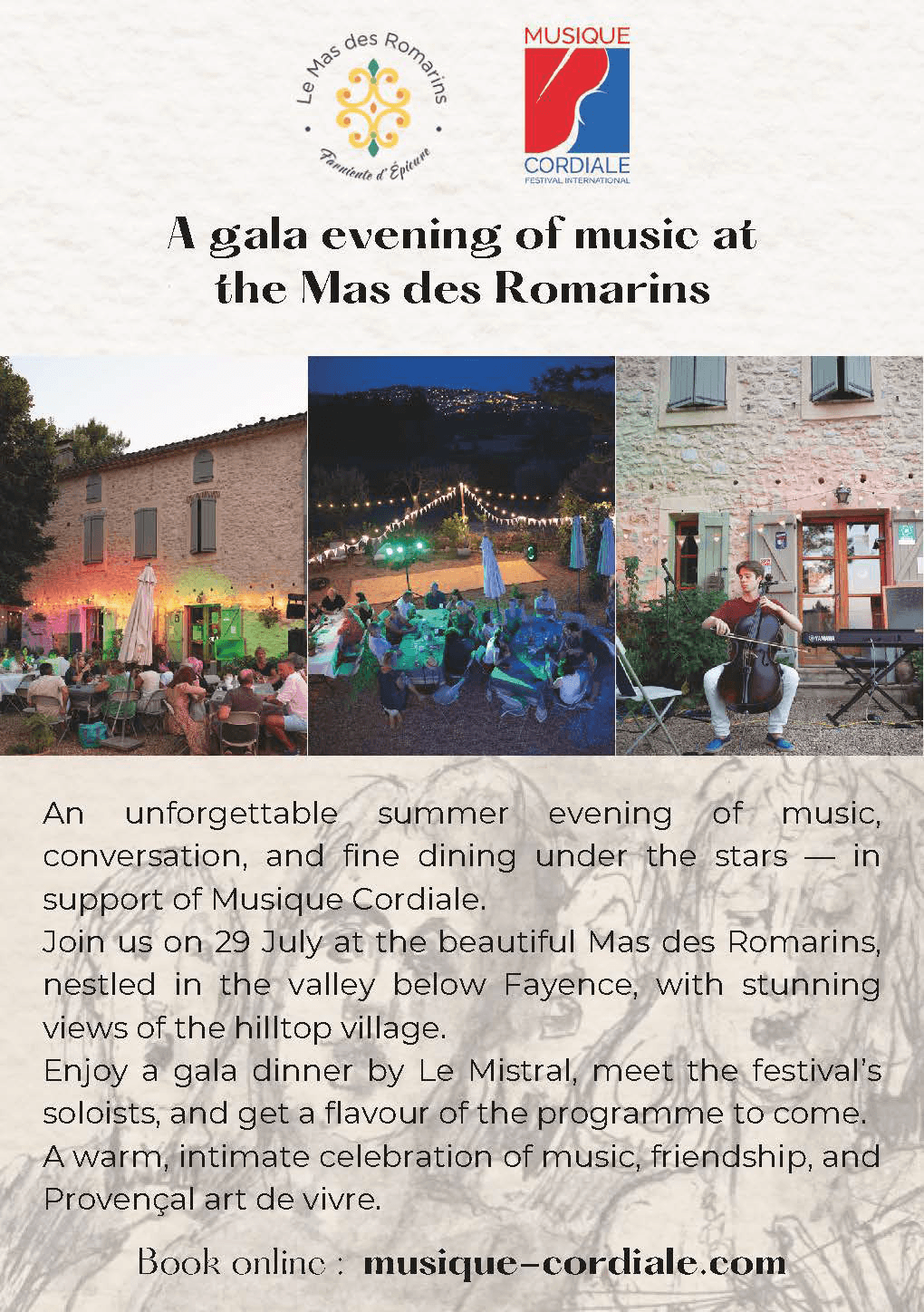 2024 was our 20th annual Festival but now we look forward to seeing you back in Seillans & other towns of the Pays de Fayence to enjoy our exciting 2025 programme of music and exciting performance devised by our new artistic team! And these begin with a vital & convivial FUNDRAISING CONCERT, with dinner, drinks and music to reflect the festival repertoire – over the evening of 29 July, starting from 6PM: book to join a table or come on your own and meet new friends at Le Mas des Romarins among the vineyards below Fayence! THIS EVENT IS NOW SOLD OUT. There are tickets available for all other festival concerts this summer. Please BOOK NOW!